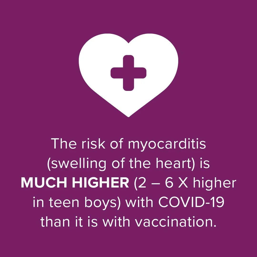 The risk of myocarditis (swelling of the heart) is MUCH HIGHER (2-6X higher in teen boys) with COVID-19 than it is with vaccination.